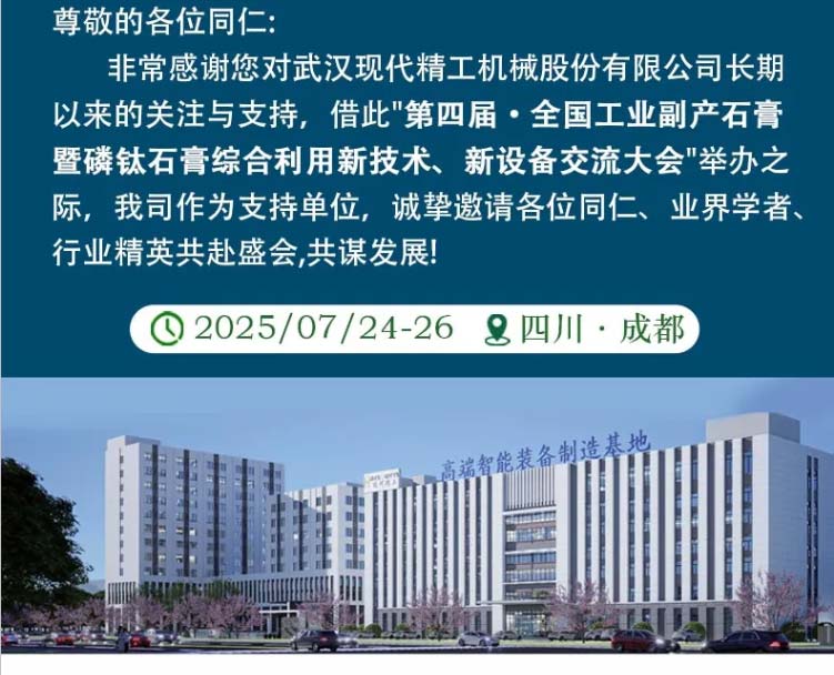 現(xiàn)代精工誠邀您共赴第四屆全國工業(yè)副產(chǎn)石膏暨磷鈦石膏綜合利用新技術(shù)、新設(shè)備交流大會